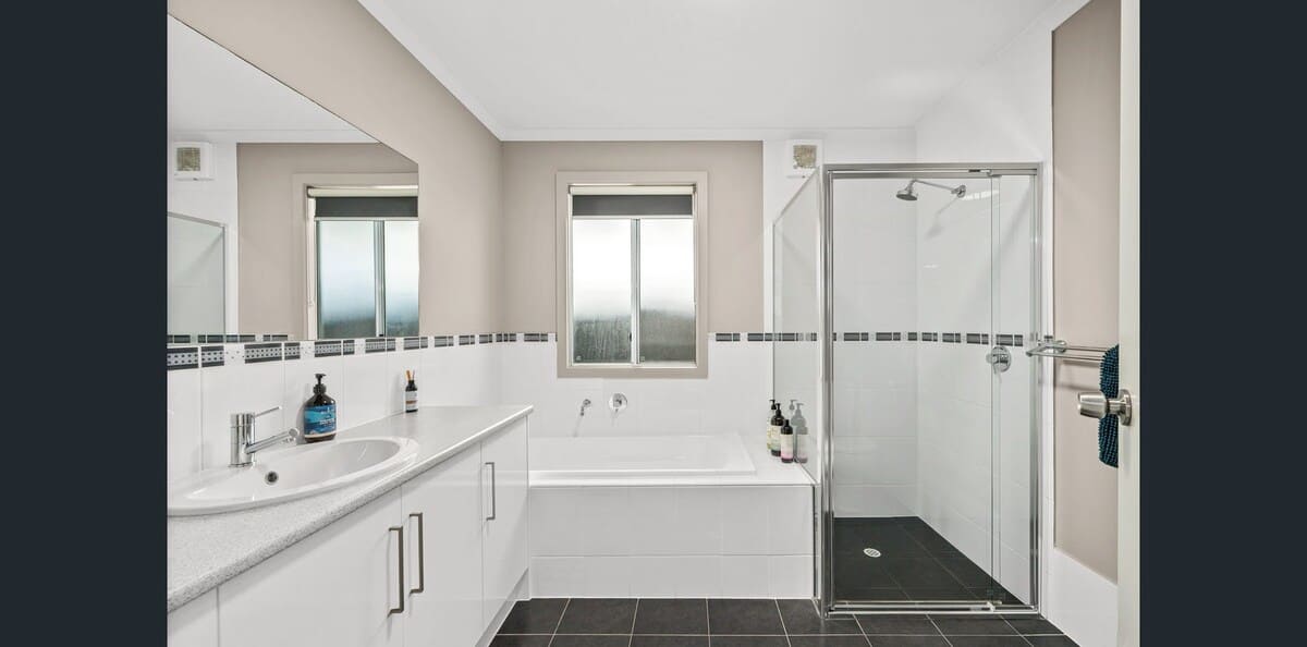 The master bedroom upstairs includes a private ensuite with double vanity, shower, and toilet.