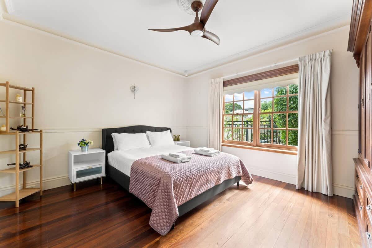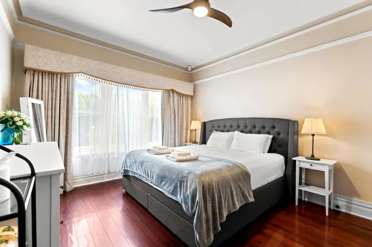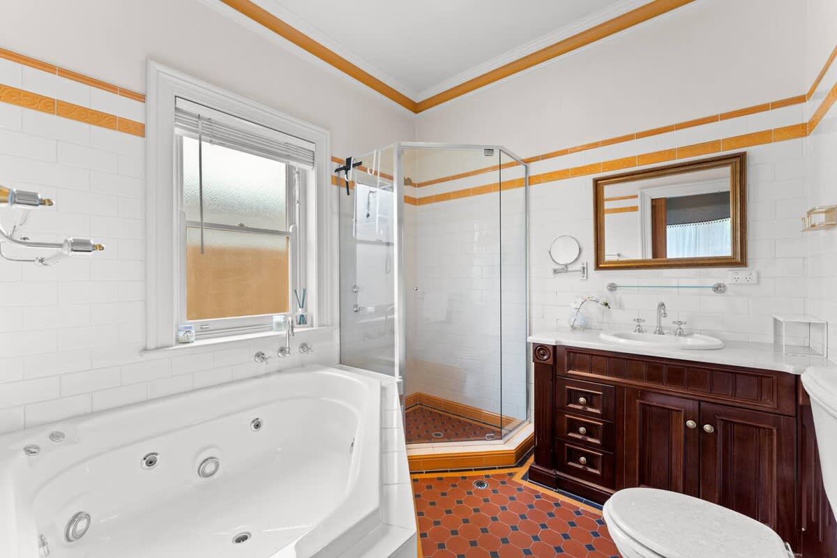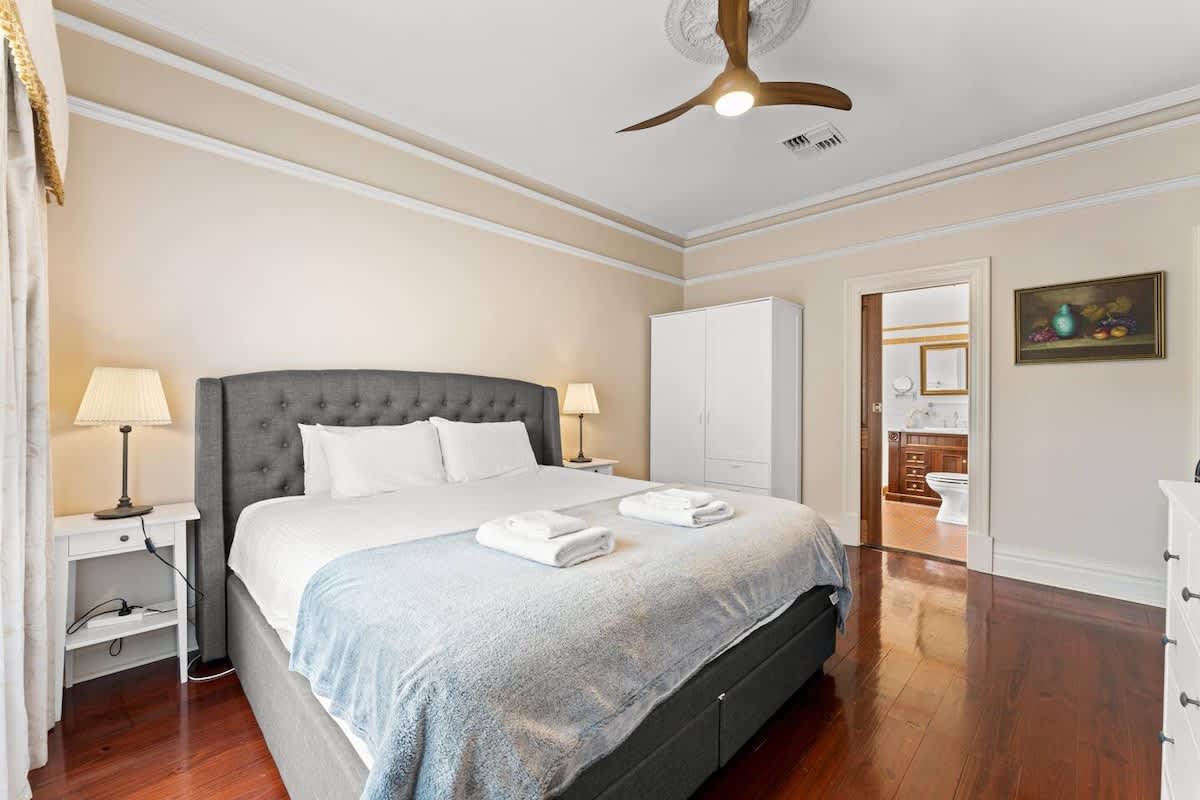 The master bedroom is a tranquil retreat with a king-sized bed, walk-in wardrobe, and a luxurious ensuite bathroom. The ensuite features a large spa bath, separate shower, and toilet, making it a perfect place to relax and rejuvenate.