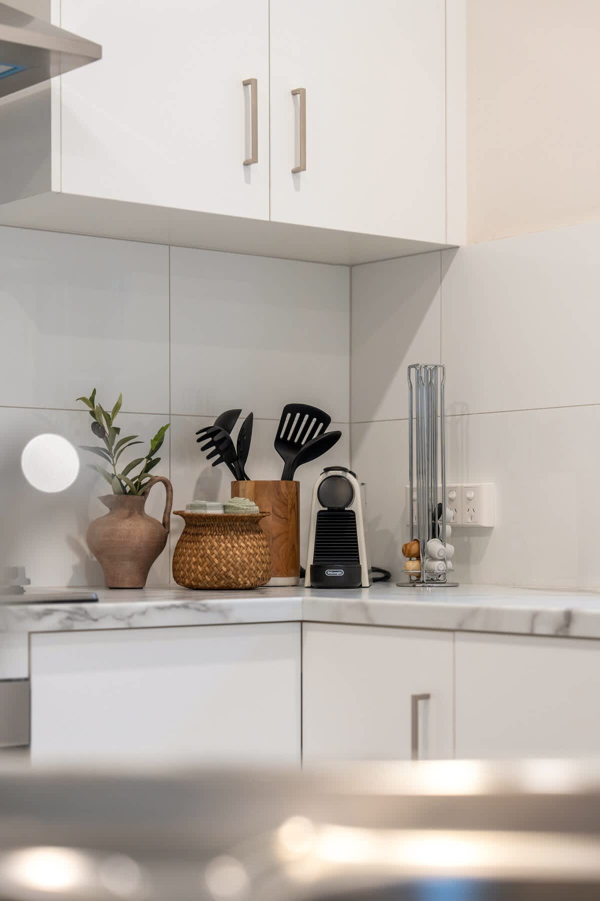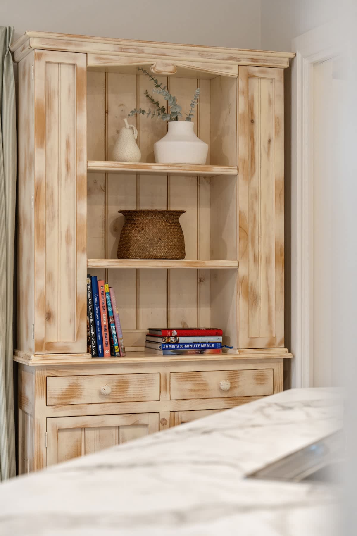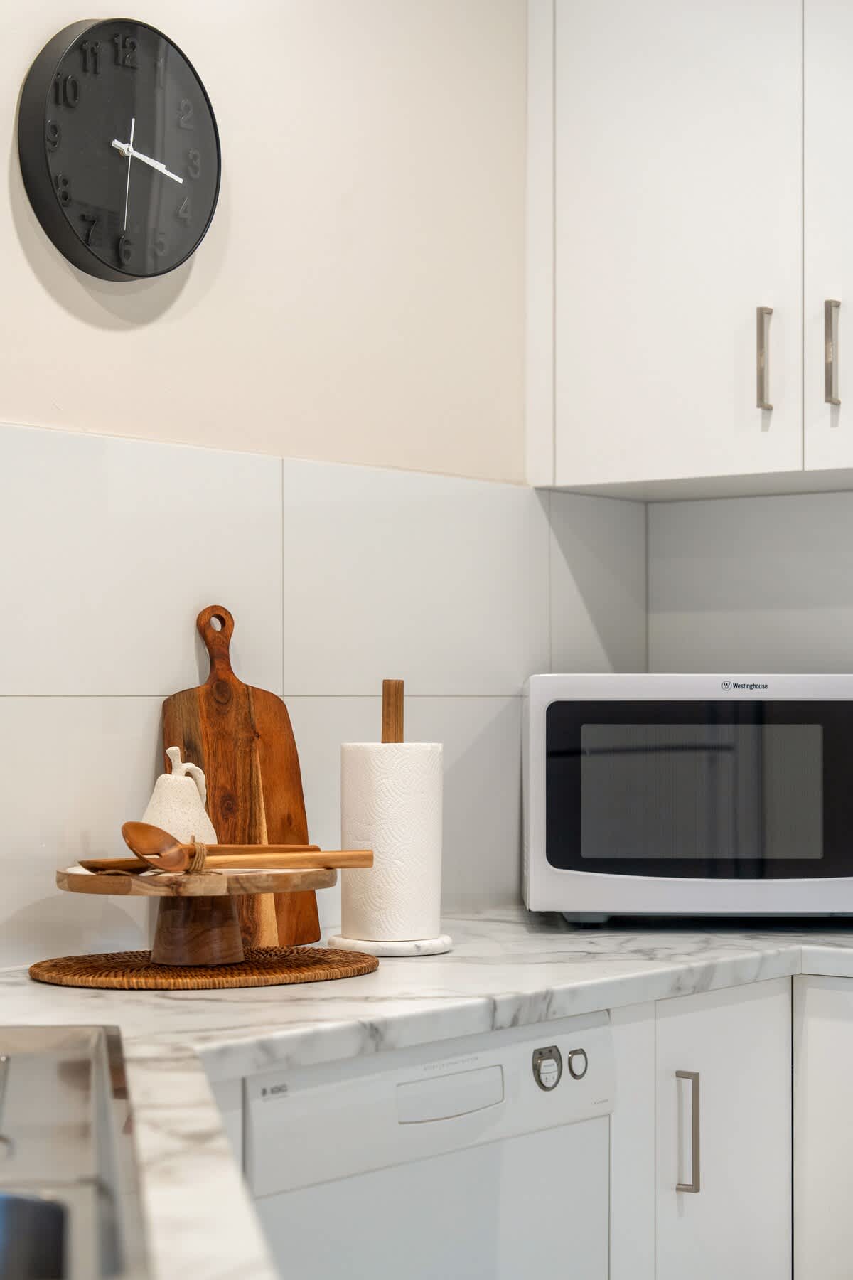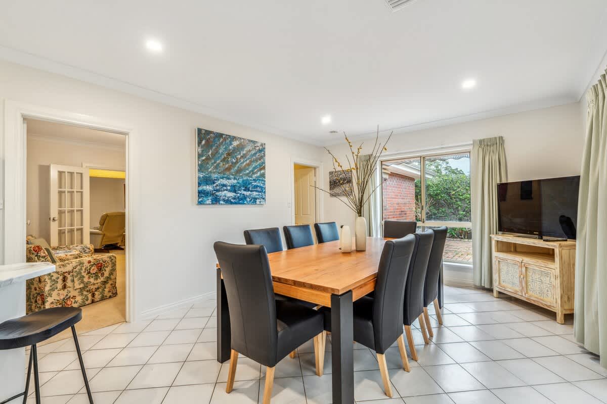 The open-plan kitchen and dining area is at the heart of the home, offering everything needed for a comfortable extended stay. The kitchen is well-equipped with modern appliances including an oven, cooktop, fridge/freezer, microwave, Nespresso machine, and all the cookware and utensils you’ll need to prepare meals with ease. A breakfast bar with stools offers casual seating, while the dining area seats eight comfortably and includes a TV for relaxed, informal meals.
