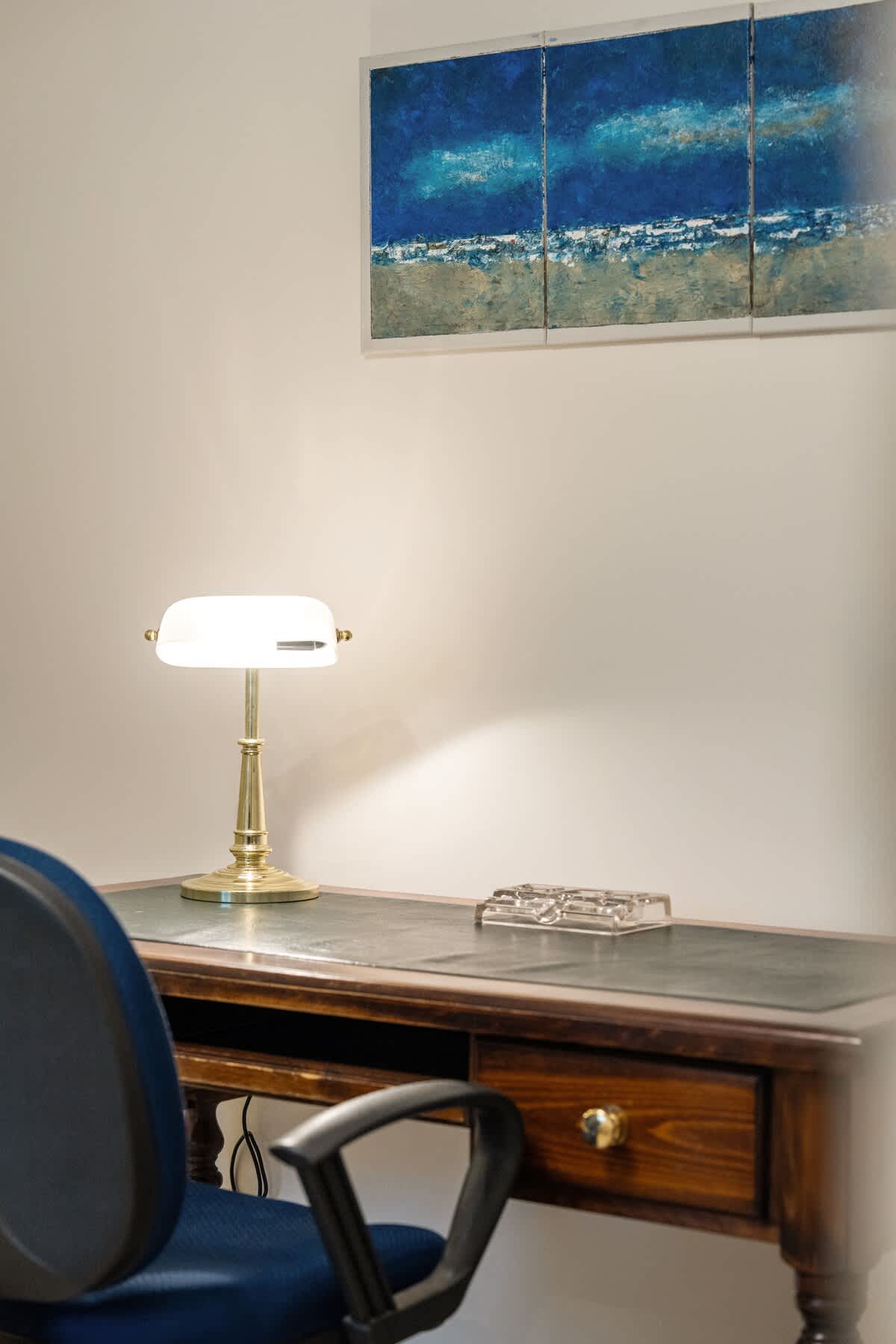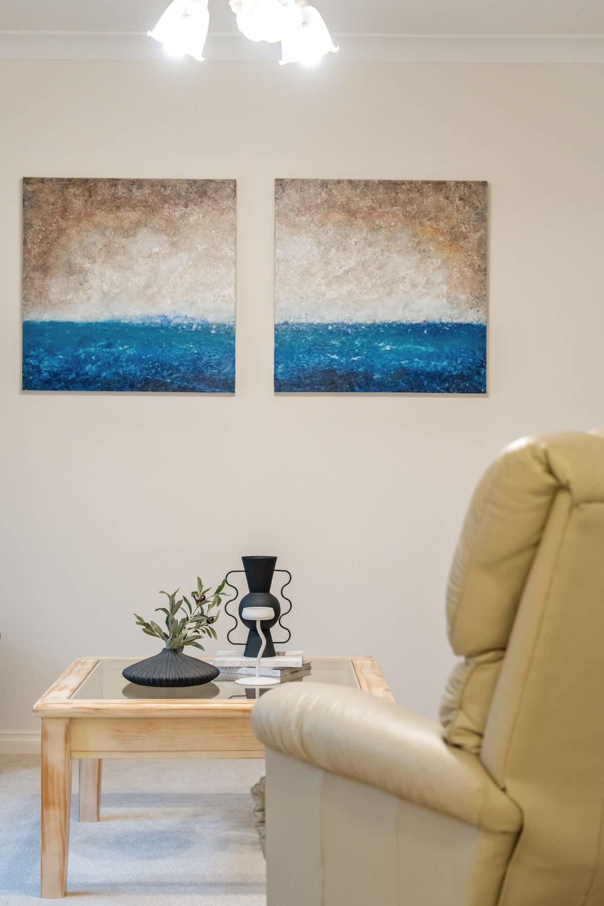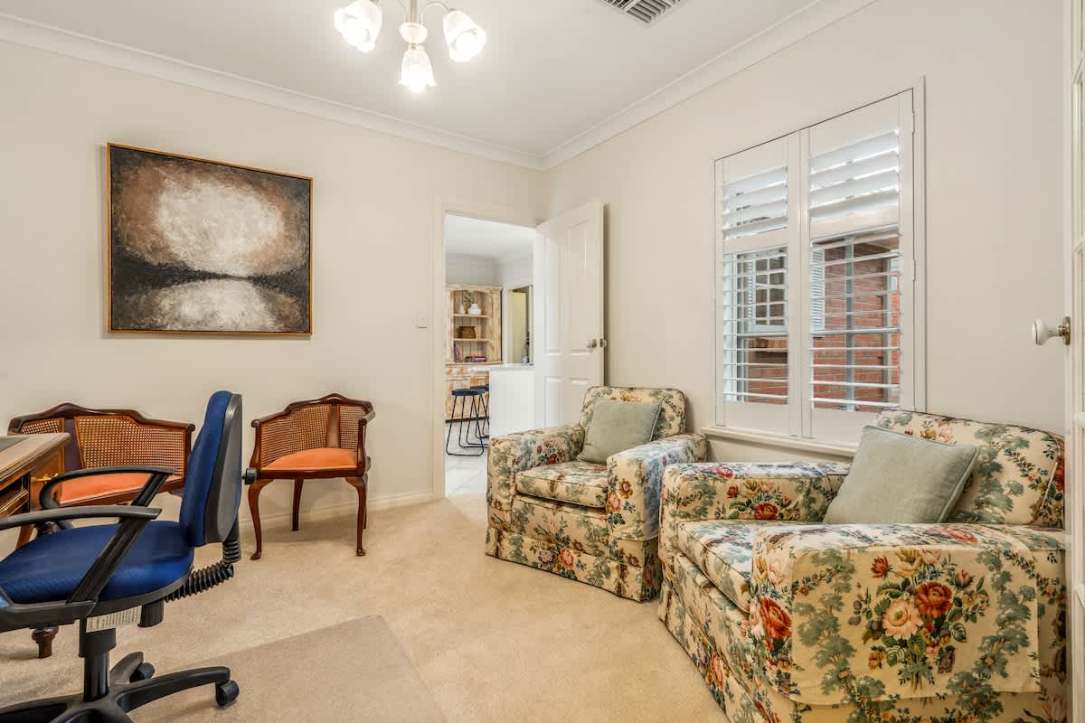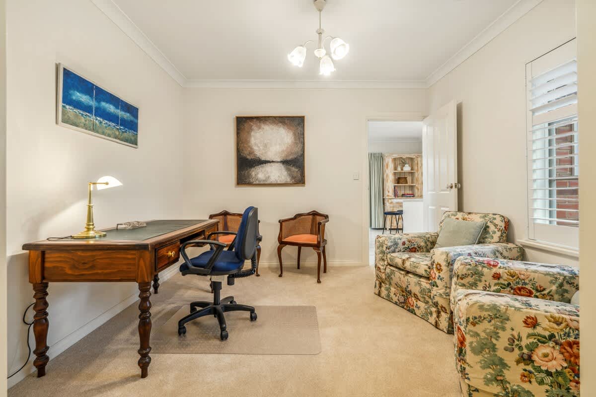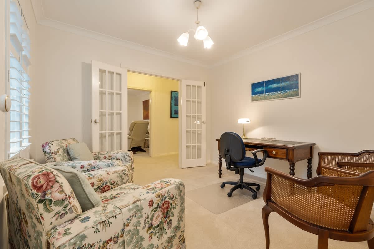 As you enter the home through smart keyless entry, you're welcomed by a calming, neutral interior and plenty of natural light. The first room you’ll find is a dedicated home office, ideal for business travellers or those working remotely. Complete with a desk, comfortable chairs, and soft lighting, it also doubles as a quiet reading nook or a space to unwind.