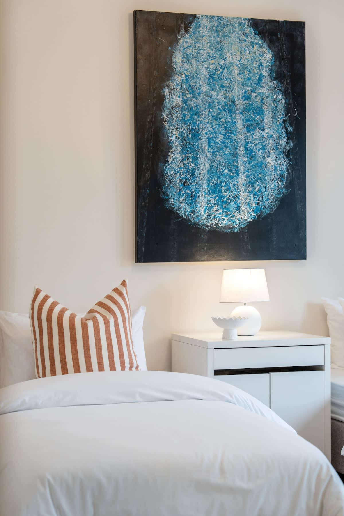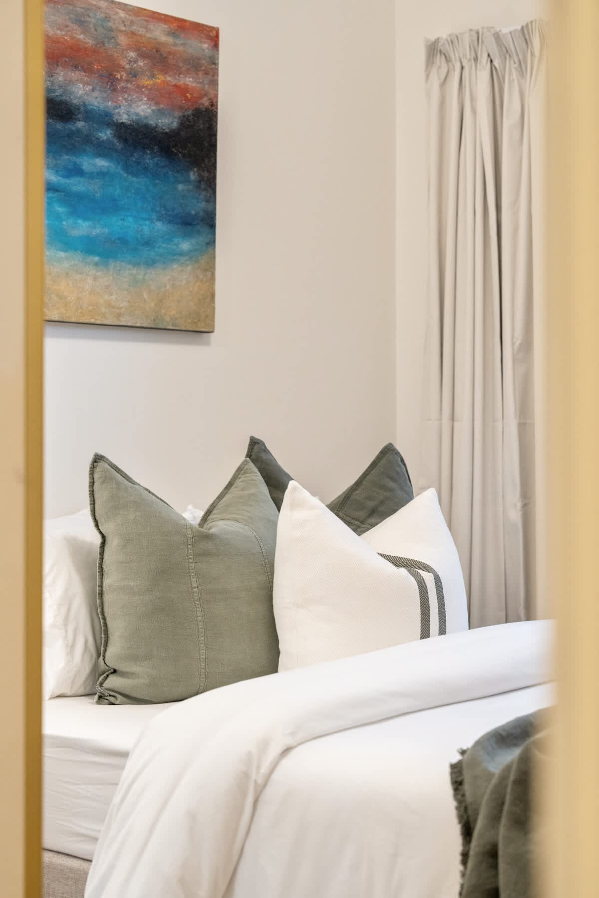 Across the hall, Bedroom 2 includes two single beds, a bedside table and lamp, and a built-in wardrobe, making it ideal for children or extra guests. Bedroom 3 features another queen-size bed, a bedside table, floor lamp, and built-in robe—styled as a calming retreat for restful sleep.