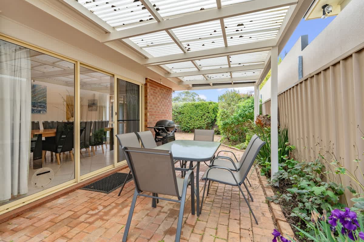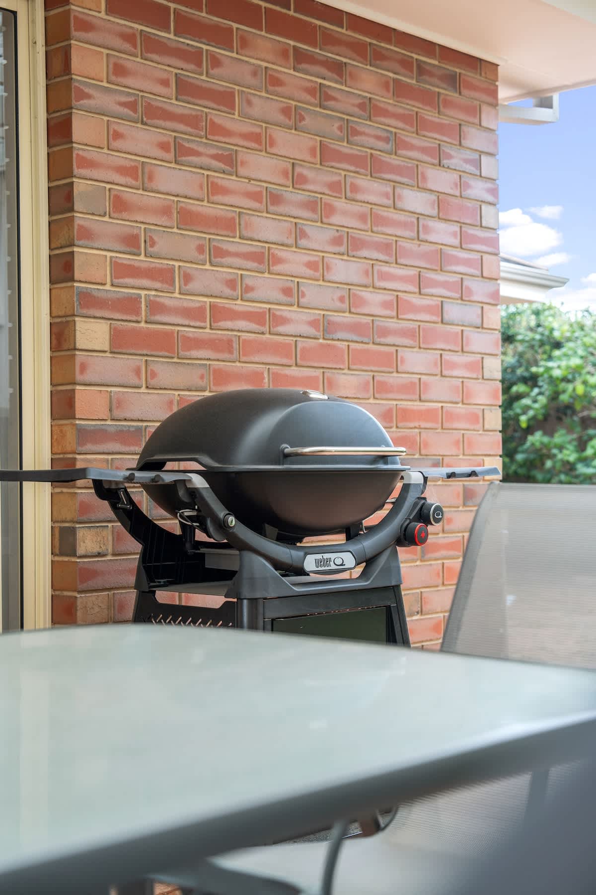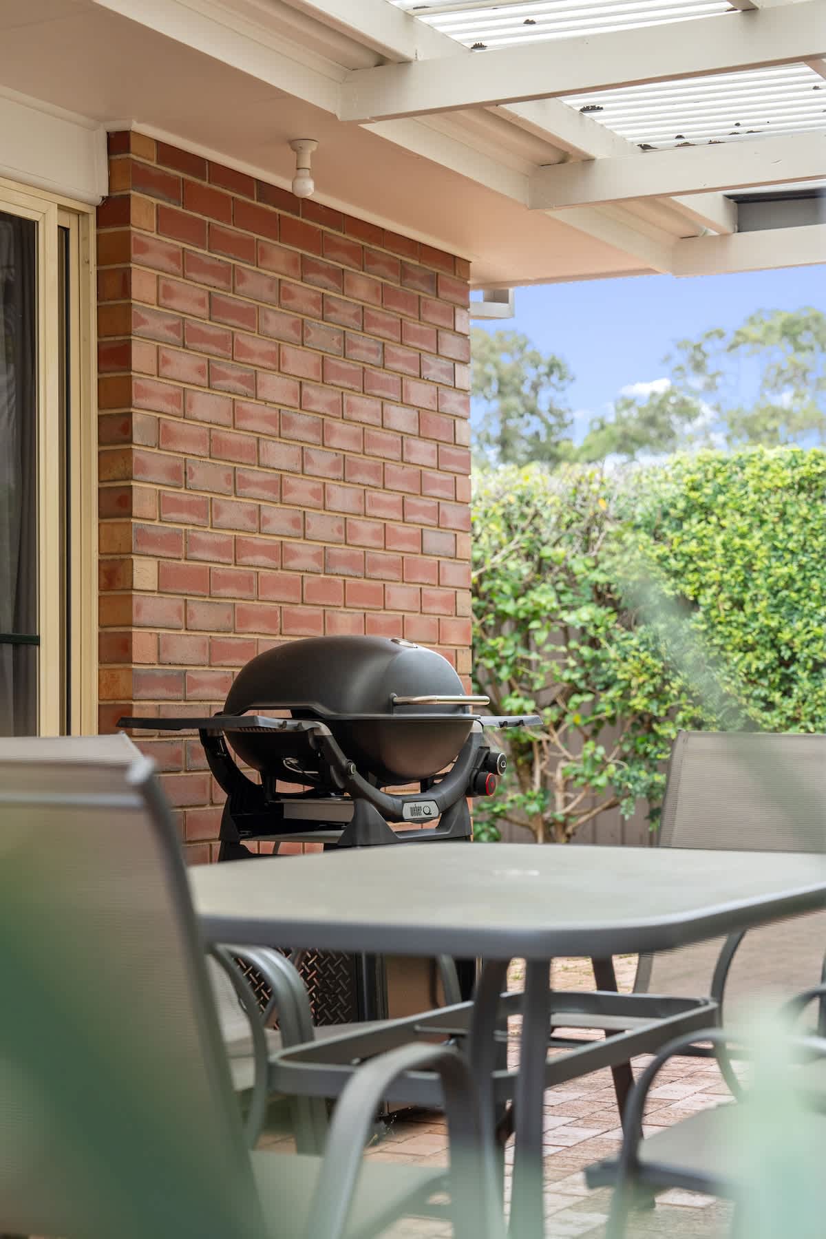 Outside, the private backyard patio is set up for relaxed outdoor dining with a six-seater table and BBQ facilities—perfect for sunny afternoons or warm evenings under the stars.