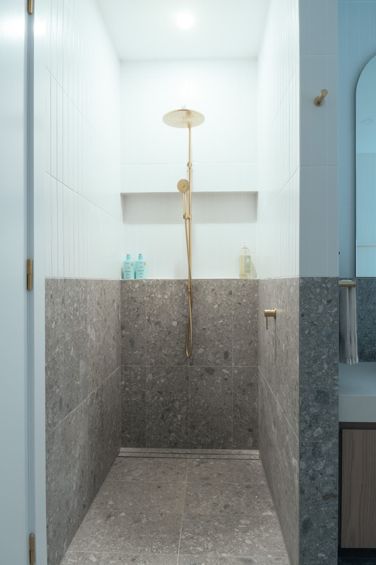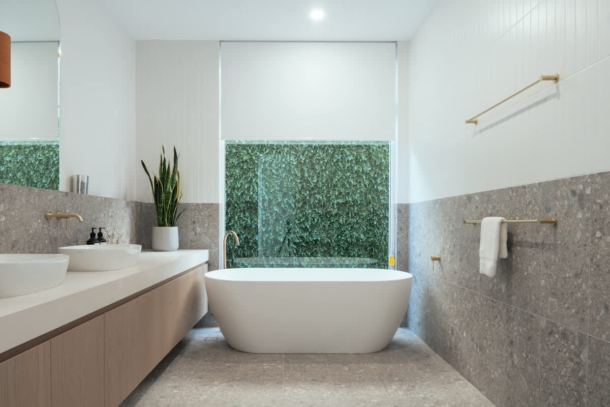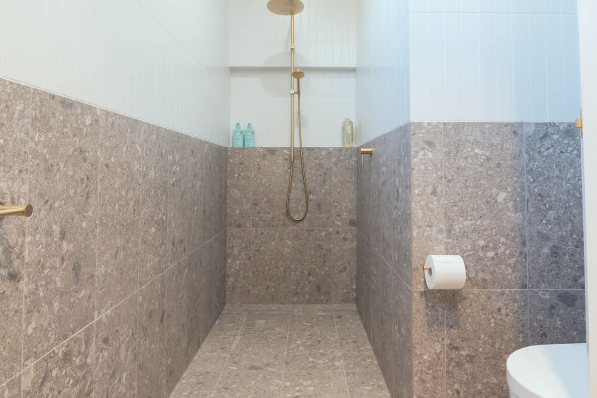 Main Bathroom (Downstairs) – A modern sanctuary with a walk-in shower, large bathtub, and toilet.